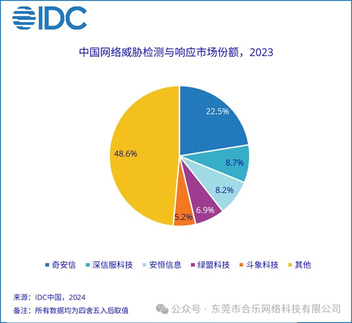 根据IDC数据显示,2023年中国网络威胁检测与响应市场规模为23.8亿元人民币,相较于2022年实现了1.6%的同比增长。从市场份额来看,奇安信、深信服科技、安恒信息、绿盟科技、斗象科技等厂商组成了该市场的主要玩家。具体内容详见下图: